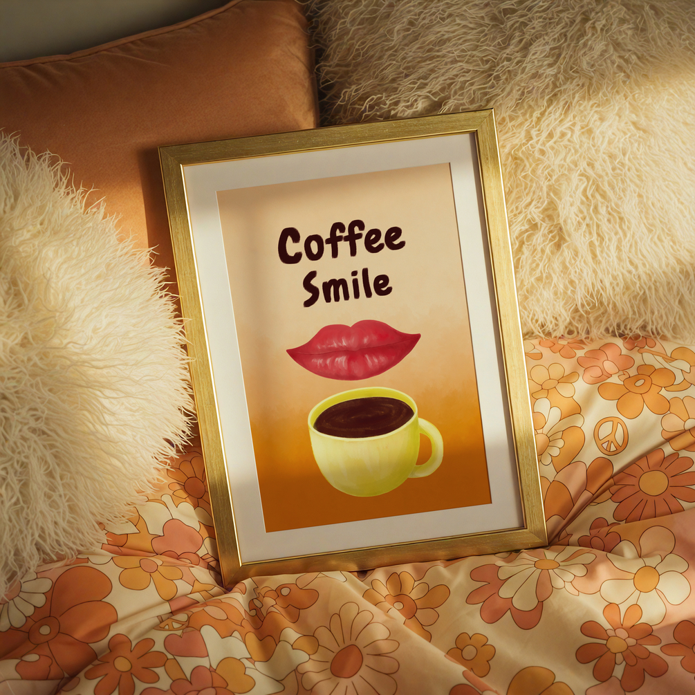 “Coffee Smile” features a playful red smile above a warm yellow cup, set against a vibrant orange gradient — perfect for cozy kitchens, cafés, or your coffee nook.